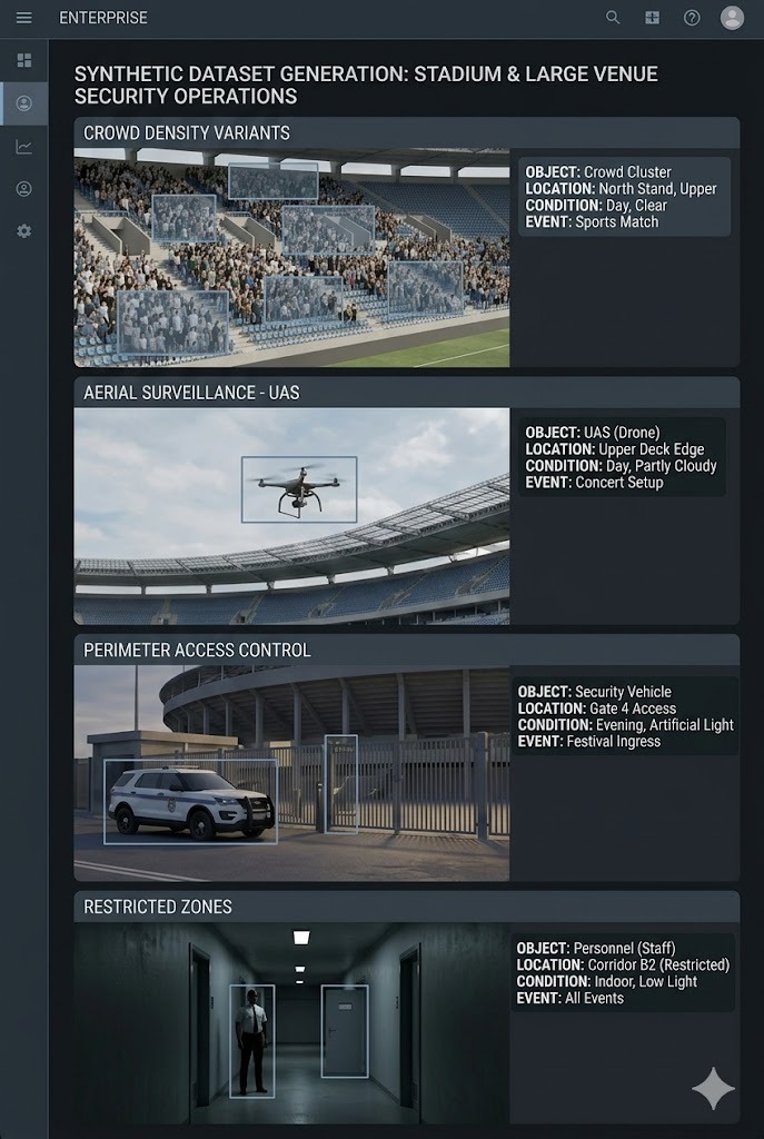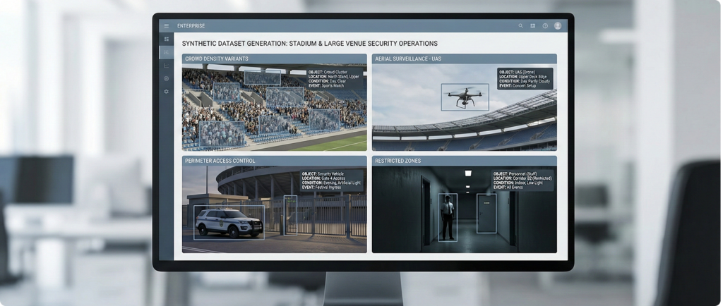 Generate synthetic data matched to facility layouts, crowd patterns, and typical activity so detection models perform in context.