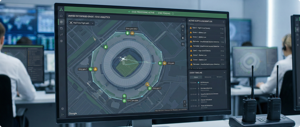TacOS runs AI models on UAS and fixed sensors during events, providing real-time awareness without depending on connectivity that may degrade under peak load.