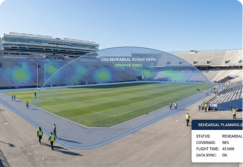 Rehearse UAS flight plans, camera coverage, and coordination between aerial, fixed, and ground teams