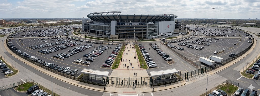 Crowd and Vehicle Patterns: Generate imagery showing realistic attendance flows, parking activity, and pedestrian movement around venues