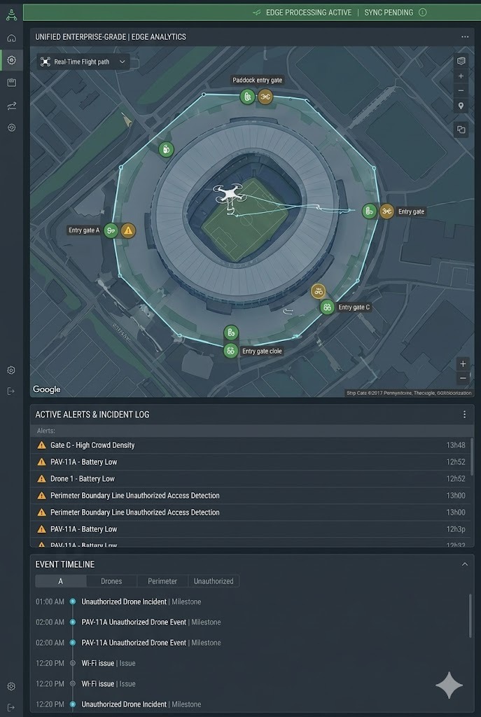 Unified Security Picture: Fuse aerial, fixed camera, and ground sensor data into views accessible to venue operators and partners